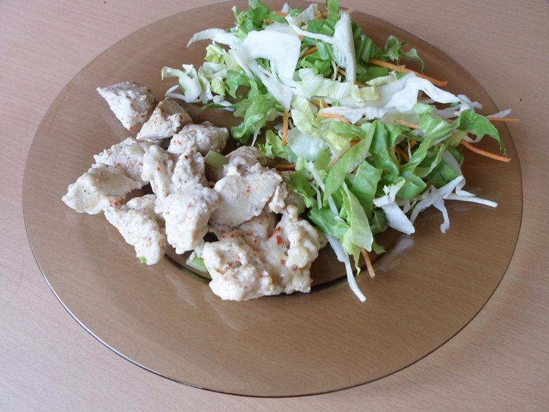 A csirkemellet megmossuk, kockázzuk, sózzuk, majd vízben legmagasabb fokozaton 5 percre betesszük a mikróba.